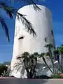 La superficie de la fachada está ligeramente inclinada, siendo la planta de la base más ancha que la terraza. por lo que más que un cilindro tiene alzada de tronco cilíndrico.