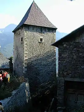 Es una torre de grandes[2]dimensiones, exenta y de planta cuadrada. Está cubierta con losa de pizarra a cuatro vertientes. Tiene cinco alturas y en los pisos más altos se suceden vanos y aspilleras. Tiene una hilera de huecos en la cuarta planta que podría ser la sujeción de un antiguo cadalso de madera. Esta torre está levantada sobre el cauce de un torrente, lo que la convierte en la única torre puente del Alto Aragón.
