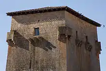 Debía terminar en un adarve almenado, último reducto para la defensa de la torre. Luego, al caerse la bóveda de cubierta, se reconstruyó con el tejado que hoy tiene y que ya aparece en grabados del siglo XIX. La base mide 10 por 14 metros de lado, que en lo alto se reduce a 7,50 por 11, respectivamente. El grosor es de 3 metros y la altura alcanza los 22 metros.[2]