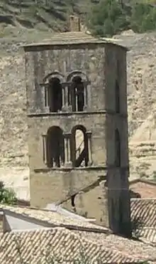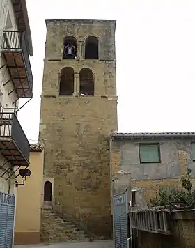 Su fábrica es de sillería que conserva marcas de cantero al exterior y al interior. Tiene tres cuerpos, de los cuales los dos últimos son el campanario, que en dos de sus frentes está abierto por arcos geminados superpuestos, solucionados de distinta forma, según el número y disposición de columnillas en que se apoyan. Los capiteles son lisos. En el frente de poniente, los arcos están enmarcados por una moldura con taqueado jaqués que también aparece en la cornisa del tejado, apoyada en modillones, lo mismo que el resto de los frentes.