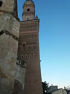 La base es de planta cuadrangular y tiene dos cuerpos bien diferenciados.[1][2] El cuerpo inferior de la torre, tiene estructura de alminar almohade con torre y contra-torre y según algunos autores, podría ser una auténtica torre almohade de finales del siglo XI perteneciente a la mezquita pre-existente, otros autores opinan que es una torre mudéjar del siglo XIII. La peculiaridad de la construcción, es que a diferencia de otras torres en las que existe un machón central sobre el que se asienta la escalera, en esta torre, como en los alminares almohades, existe una torre interior contenida dentro de la que vemos decorada y que se unen mediante las escaleras que están cubiertas por bóvedas de medio cañón y crucería simple. La torre interior es una sucesión de cuatro estancias superpuestas cubiertas por bóvedas de distinta configuración. En la torre exterior, los vanos del cuerpo inferior son uno aquillado y otro rebajado. La decoración presenta bandas superpuestas de arcos de herradura apuntados, aspas inscritas en cuadrados, espigas, esquinillas y arcos apuntados entrecruzados, todo ello combinado con ataifores y columnillas de cerámica de color verde y miel muy característicos.[3] Durante la reciente restauración, en la parte oculta de la torre, se han encontrado ataifores originales con decoraciones propias de la época califal, lo que apoya la tesis de que se trata de una auténtica torre almohade del siglo XI perteneciente a la mezquita preexistente.