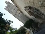 Tiene dos cuerpos rectangulares, alojándose la escalera en el más estrecho. Está construida con arenisca de cemento calcáreo, piedra de la Sierra de San Cristóbal.[4]