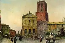 La Torre de las Milicias y Santa Catalina en Roma, pintura de Ettore R. Franz (ca. 1880)