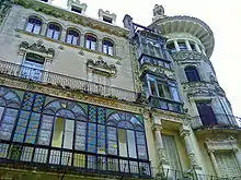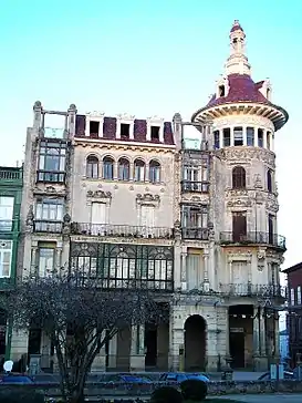 Cuenta con diversos adornos, como alicatados, mármol, vidrieras, grecas, tejado con tejas de porcelana (cerámica vidriada) de color rojo o pilastras. La cúpula de la torre principal es sustentada por cuatro cariátides. La planta dispone de 950 m², y el solar, 1050 m² (mediciones tomadas usando SIXPAC). Consta de planta baja, entresuelo, tres plantas de pisos y bajocubierta, la parte que sobresale de la torre principal. Se llevaron a cabo varias restauraciones parciales, que ahora sólo garantizan que no avance más el deterioro del edificio.