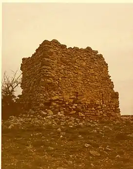 “Mota”: En el extremo NE de la terraza superior un montículo de piedras de unos 11 m de diámetro y no más de 1,5 m de altura delata una construcción arruinada, quizá otra torre, de planta ignorada. En su glacis N aflora un paramento rectilíneo.