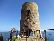 La torre tiene una forma troncocónica y está construida en mampostería realizada con piedra del lugar y mortero de cal. La entrada se realiza por una puerta de arco rebajado situada a unos 7 metros de altura a la que hoy se puede acceder mediante una escalera metálica fija. En su interior posee una estancia de la que parte una escalera interna de un tramo curvo que permite acceder a la azotea de la torre. La parte inferior de la torre tiene un hueco que permite atravesarla para acceder al borde del acantilado sobre el que la torre está construida.