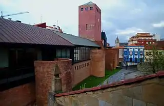 Situada en un lateral de las 2 torres de acceso al asentamiento romano amurallado de Gijón, habiendo restos arqueológicos de la puerta de la muralla en la base.