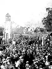 En su papel de alcalde, Michel pidió a los alcaldes de otros distritos de la costa oeste que también declararan el viernes 14 de febrero de 1902 como día festivo[12][13] y los alcaldes de los distritos de Brunner, Ross, Greymouth y Kumara lo hicieron.[14][15] Cuando Seddon llegó a Hokitika, su primera acción oficial fue colocar el primer pilote del puente ferroviario sobre el río Hokitika para que el ferrocarril pudiera extenderse hacia el sur; lo que se conoció como Ross Branch llegaría a Ross en 1909. Inmediatamente después, Seddon colocó la primera piedra de lo que entonces se conocía como el Westland War Memorial. Esto se hizo como una ceremonia masónica completa, con Seddon como Gran Maestro interino en representación de la Gran Logia de Nueva Zelanda. Ambas ceremonias se llevaron a cabo bajo una lluvia torrencial, pero hubo una "asistencia muy grande" por parte de la gente de Westland.[1][16] Como era habitual en ese momento, se recaudaron fondos para el monumento, y Louisa Jane Seddon (la esposa del primer ministro) había recaudado NZ£ 70 de ex habitantes de la costa oeste que vivían en la capital del país, Wellington.[6][17]