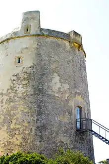 Con planta circular y una altura de 13'35 metros desde el baquetón de medio boce al plinto, es un robusto edificio construido en mampostería. Tiene forma troncocónica sobre plinto circular de catorce metros y cinco centímetros de altura hasta el pretil del terrado. El vano de entrada da paso a un zaguán engastado en el muro de la torre y éste, a su vez, es el acceso al único habitáculo de la misma, que se asienta sobre su colmatado cuerpo inferior.