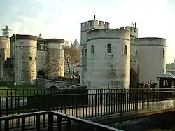 Frente a esta torre, se encontraba la ahora extinta Torre del León. La torre fue construida en la década de 1280 por orden de Eduardo I de Inglaterra, junto al anillo de protección exterior de la fortaleza. Al igual que la Torre Byward, similar pero más grande, la puerta tiene dos torres exteriores grandes y redondas que están conectadas entre sí. En la parte trasera hay torreones rectangulares más pequeños en los que hay salones.[2]