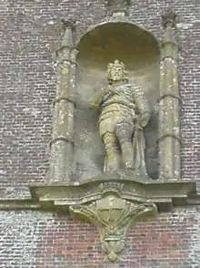 La cara 'frontal' (la del sureste) de la torre tiene una puerta de entrada con una hornacina gótica sobre ella, con una estatua del rey Alfredo, y un panel de piedra con una inscripción (véase abajo). Esta es la cara que la mayoría de visitantes ven primero cuando caminan desde los jardines de Stourhead o desde el aparcamiento cercano.