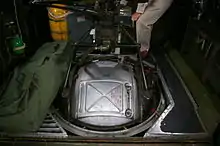 ![]() Un artillero posa con la torreta esférica Sperry de un B-24 de la Royal Air Force en Birmania, 1943-1945. | ||