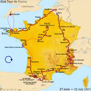 El 61.º Tour de Francia se disputó entre el 27 de junio y el 21 de julio de 1974 con un recorrido de 4098 km., divididos en un prólogo y 22 etapas; de ellas, la sexta, la octava, la decimonovena y la vigésima primera estuvieron divididas en dos sectores. Participaron 13 equipos de 10 corredores de los que solo uno logró finalizar la prueba con todos sus integrantes. El vencedor cubrió la prueba a una velocidad media de 35,241 km/h.