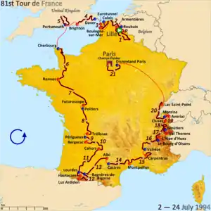 El 81.º Tour de Francia se disputó del 2 al 24 de julio de 1994 sobre un recorrido de 21 etapas y con un total de 3.978 km que se cubrieron a una velocidad media de 38,383 km/h. La carrera comenzó en Lille y terminó en París, en el clásico final de los Campos Elíseos.