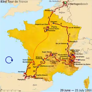 El 83.º Tour de Francia se disputó del 29 de junio al 21 de julio de 1996 sobre un recorrido de 21 etapas más el prólogo inicial, y con un total de 3765 km. que el vencedor cubrió a una velocidad media de 39,236 Km/h. La carrera comenzó en Bolduque (Países Bajos) y terminó en París, en el clásico final de los Campos Elíseos.