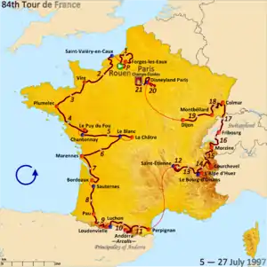 El 84.º Tour de Francia se disputó del 5 al 27 de julio de 1997 sobre un recorrido de 21 etapas + el prólogo inicial, y con un total de 3944 km. que el vencedor cubrió a una velocidad media de 39,237 km./h. La carrera comenzó en Ruan y terminó en París, en el clásico final de los Campos Elíseos. El vencedor final, Jan Ullrich, fue el primer ciclista alemán en lograr el triunfo en la ronda francesa.