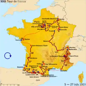 El 90.º Tour de Francia se disputó del 5 al 27 de julio de 2003 sobre un recorrido de 20 etapas más el prólogo inicial, y con un total de 3426 km que el vencedor cubrió a una velocidad media de 40,940 km/h La carrera comenzó y terminó en París, en el clásico final de los Campos Elíseos.
