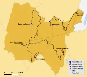 El Tour de l'Ain dispuso de tres etapas para un recorrido total de 405,4 kilómetros, divido en una etapa llanada, una etapa de media montaña y una etapa de montaña con final en alto en el Col du Grand Colombier.[2][3]