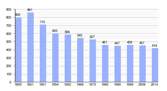 Los datos demográficos contemplados en este gráfico de la comuna de Touzac[4] se han cogido de 1800 a 1999 de la página francesa EHESS/Cassini, y los demás datos de la página del INSEE.[5]