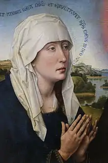Van der Weyden había utilizado la técnica de las inscripciones flotantes antes, especialmente en la tabla central del Retablo Beaune de hacia 1445-50, donde las palabras parecen flotar en el espacio pictórico o estar aparentemente cosidas a la ropa de las figuras.[5]