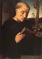 La obra destaca por el realismo de la ambientación y la atención al detalle y calidades materiales, típica de los maestros flamencos. Las figuras aparecen de medio cuerpo y se apoyan en un parapeto fingido, una ilusión que justificaba el corte a medias de las figuras y permitía una fusión entre el mundo real y el pintado por medio de la proyección hacia afuera de elementos, como en este caso la manga del santo, el cojín en el que descansa el Niño y el codo del comitente.