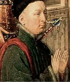 Una lanza descansa contra el hombro de un San Miguel con aspecto juvenil.[31] Miguel está ricamente vestido con una armadura enjoyada y de color, con su brazo izquierdo sosteniendo su casco,[22] mientras que su mano derecha se apoya en el hombro del donante mientras este es presentado a María. El donante se arrodilla en oración ante la Virgen, con sus manos extendidas orantes, a pesar de que no están juntas. Lleva un anillo de oro en su dedo meñique de la mano derecha,[19] y está vestido con una hopalanda larga de color verde oliva,[2] que en esa época era el pináculo de la moda y un indicador de estatus dentro de la corte de Borgoña.[9] El vestido tiene un forro de piel de cuello alto y grandes mangas holgadas, también forradas con piel. El corte de pelo del donante, en forma de tazón, redondeado en el flequillo, pero cortado por encima de las orejas, también es típico de mediados de la década de 1430 en la moda flamenca. Excepto por la capucha roja, la prenda se asemeja mucho a la usada por el novio en el Retrato de Arnolfini.[32]