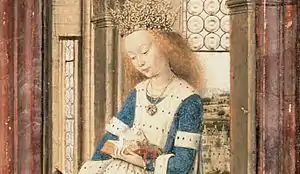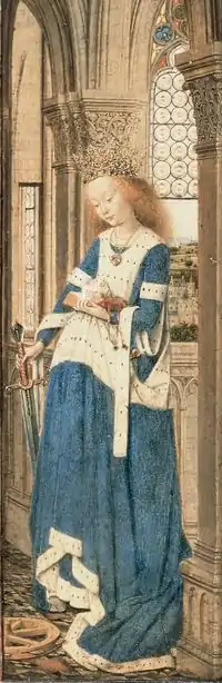 En el panel de la derecha, santa Catalina se presenta casi como la esencia de una princesa gótica. Está leyendo un libro con "encantadora modestia",[1] con el pelo rubio suelto, adornado con una elaborada corona con joyas, muy similar a la de la Virgen del canciller Rolin, combinado con su vestido azul y un tabardo de armiño blanco drapeado, que la muestra como la princesa que era. Una cadena de oro con un pendiente colgante con joyas viste su cuello. Los atributos asociados a ella están presentes en esta representación. En su mano derecha, sostiene la espada usada en su decapitación y a sus pies se encuentra la rueda en la que fue torturada.[28] Como la mujer en el Retrato de Arnolfini de van Eyck, tiene "la forma de pera que estaba de moda"; Heath describe su vestimenta como "más deslumbrante que la de Virgen", reflejándose en la armadura de San Miguel en el panel opuesto.[29]