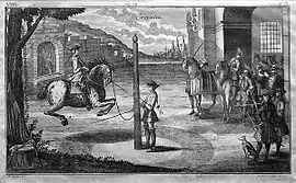 Grabado histórico de un caballo que es trabajado por un entrenador con una línea llamada longe.