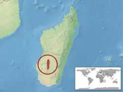 Es endémica de Madagascar. Su rango altitudinal oscila entre 700 y 750 msnm.