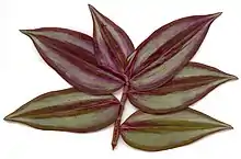 Tiene atractivas hojas purpúreo verdosas, las más nuevas y superiores púrpuras, y las más viejas e inferiores verdes con dos tiras plateadas, las hojas más viejas muestran un uniforme magenta profundo.