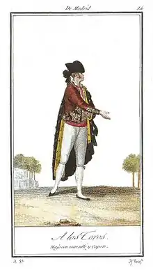 Esta prenda se componía de: jaqueta, calzones de tapa, chaleco, camisa, faja, pañuelo al cuello, cofia, sombrero de tres picos o chambergo, medias, zapatos de hebilla y capa. Era un traje muy lujoso y ornamental (cintas, pasamanerías y aplicación de elementos metálicos), en contraposición a la rigidez de la etiqueta aristocrática.[2]