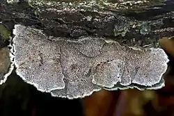 Basidiocarpo, anual, sésil, imbricado, de 2.5-5 cm, con un radio de 1-2 cm aproximadamente, grosor de 2 mm. Forma flabeliforme, abriéndose a partir del sustrato, de color blanco a negro, pasando por tonos grises de distintos matices. De superficie vellosa en los especímenes jóvenes, quedando glabra en ejemplares adultos, con el borde ondulado de manera irregular. Himenio de color blanquecino a marrón en la etapa adulta, de 1-3 poros angulares por mm. Esporas de 5.5-6 x 2.5-4 μm, fusiformes, lisas, hialinas; hifas de 4 μm de diámetro.[1][2][3][4][5][6][7][8]