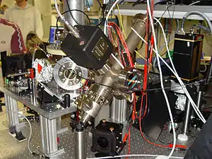 - Esta obra contiene una traducción derivada de «Ion trap» de Wikipedia en inglés, concretamente de esta versión del 26 de febrero de 2013, publicada por sus editores bajo la Licencia de documentación libre de GNU y la Licencia Creative Commons Atribución-CompartirIgual 3.0 Unported.