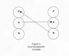 Una transacción es un solo estímulo y una sola respuesta en la comunicación, en la que existe un nivel social (en las figuras representado por la línea continua), que es el evidente y el que con frecuencia está reflejado en el nivel verbal, así como un nivel psicológico subyacente (en las figuras representado por la línea discontinua), que con frecuencia está reflejado en el nivel no verbal.