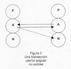 En las transacciones ulteriores angulares (Fig. 3) desde un mismo estado del yo de una persona parte un doble estímulo, social y psicológico, que se dirige a dos estados del yo de la otra persona, uno recibiendo el estímulo social y el otro el psicológico. Si esta persona responde complementariamente al nivel psicológico, la transacción logra su finalidad. Si no, si responde complementariamente al nivel social, la transacción no logra lo que pretendía. Y la tercera regla para las transacciones ulteriores en general, es que en ellas su finalidad está en el nivel psicológico y no en el nivel social.