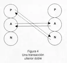 En las transacciones ulteriores dobles (Fig. 4) desde dos estados del yo de una persona parte un doble estímulo, desde un estado del yo el estímulo social y desde el otro el estímulo psicológico, dirigiéndose a dos estados del yo de la otra persona y complementándose la respuesta de esta tanto en el nivel social como en el nivel psicológico, aunque siendo este último el que rige la transacción y su finalidad, de acuerdo con la tercera regla de la comunicación anteriormente citada. Las transacciones ulteriores dobles son las que subyacen en la dinámica de los juegos psicológicos, posibilitándolos.