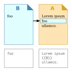 Por ejemplo, un artículo sobre un país podría incluir un gráfico de la exportación agrícola de ese país pero en otro artículo de agricultura. En lugar de copiar el gráfico y almacenarlo en dos lugares, una transclusión incorpora el diseño modular, que permite que la información se almacene en un solo lugar y, en caso de corregir o actualizar el original, actualizar ambos artículos. La referencia de este sirve para vincular ambos artículos.