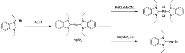 Las reacciones de transmetalación son importantes en la síntesis de diversos compuestos organometálicos. Los complejos llamados carbenos N-heterocíclicos de plata se forman fácilmente, y a menudo se utilizan para transferir los ligandos carbeno a otros metales que contienen ligandos lábiles como acetonitrilo o 1,5-ciclooctadieno[4] donde L-H+ denota al ligando precursor.