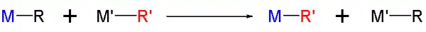 La transmetalación es un tipo de reacción química empleada en química organometálica que describe el intercambio de ligandos entre dos centros metálicos.[1][2] También puede describirse como el intercambio de un átomo de metal en un compuesto químico (generalmente un compuesto organometálico) por otro átomo de metal diferente.[3]