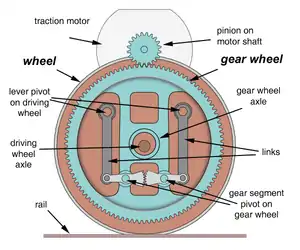 Cada par de ruedas motrices está acoplado con dos ruedas dentadas, y el motor tiene un piñón a cada lado.[2] La posición de bielas situadas en el interior de las ruedas se desfasaba unos 90 grados entre sí para reducir el desequilibrio de la unidad. Sin embargo, con esta disposición, se corría el peligro de generar tensiones mecánicas excesivas en los componentes del sistema. Esta versión del accionador se utilizó en las máquinas de mayor potencia.