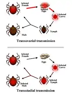 Este tipo de transmisión se observa también en otros parásitos tales como los virus o Rickettsia.[3] Además de las garrapatas, los ácaros son otro vector común.[3][4] Algunas fuentes consideran a la transmisión transestadial un tipo de transmisión horizontal,[5][6] mientras que otras fuentes la consideran un tipo de transmisión vertical o parcialmente vertical.[7][8]