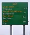 - Una señal escocesa en la isla de Skye, con nombres escritos en Gaelico Escocés e inglés, y mostrando las distancias en millas.