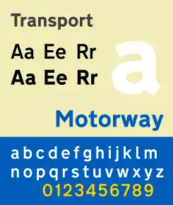 Existen dos tipos de tipografía: Transport Medium y Transport Heavy.[3] Ambas tienen la misma forma básica, pero Transport Heavy está en negrita, para permitir leer más fácil las letras negras sobre fondos blancos, así como en aquellas no usadas en carreteras no-primarias. Transport Medium es más fina y se usa en letras blancas con fondos oscuros, tales como las señales de fondo verde en rutas primarias.