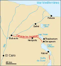 Ambas líneas marítimas podían unirse: los barcos llegados del Mediterráneo subían por el brazo Tanítico hasta Bubastis y se desviaban por un canal hasta alcanzar el uadi Tumilat, que era navegable en épocas de grandes crecidas por naves de poco calado. Atravesando los Lagos Amargos la vía alcanzaba el golfo de Suez.[2]