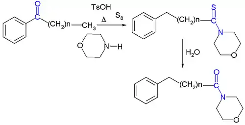 La reacción de Willgerodt-Kindler[4] se lleva a cabo con azufre elemental y una amina como la morfolina. El producto inicial es una tioacetamida[5] la cual puede ser hidrolizada a la amida. La reacción toma el nombre del químico Karl Kindler.
