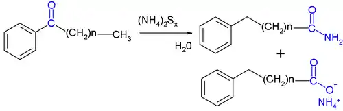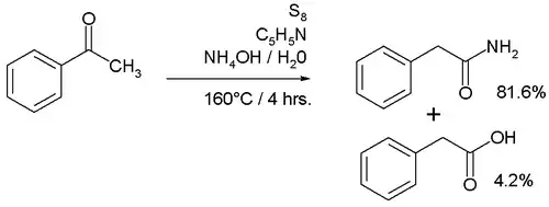 Un ejemplo con reactivos modificados (azufre, hidróxido de amonio concentrado y piridina ) es la conversión de acetofenona en 2-fenilacetamida y ácido fenilacético:[3]