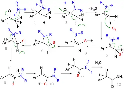 Para la primera etapa de la reacción es fundamental la formación de la imina de la cetona. Después se lleva a cabo la tautomerización del grupo amina de la morfolina a la enamina (4). Esta reacciona con el azufre para dar el sulfuro 6 . La reacción de transposición tiene lugar cuando el grupo amino ataca al tiocarbonilo 7 en una adición nucleofílica formando temporalmente un anillo de aziridina (8). Esta se escinde para formar un aminoalquenilsulfuro que tautomeriza a la tioamida 11. Esta se puede hidrolizar para formar la amida correspondiente.