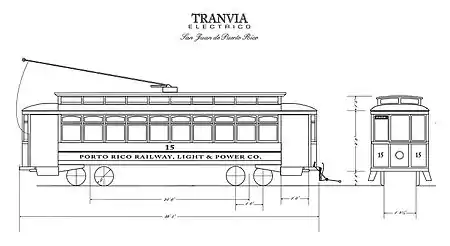 - 1901 - San Juan Light & Transit Co. - El Tranvía eléctrico inaugurado 1º de enero de 1901, apenas 22 años del primer tranvía eléctrico puesto en servicio por Werner von Siemens en Berlín en 1879,[12] el sistema fue retrochado a trocha estándar (1435 mm) y discurría por el mismo trayecto de la Avenida Ponce de León hasta Río Piedras excepto que en el Viejo San Juan serpenteaban a través de la Calle Recinto Sur, Calle San Justo, Calle Tetuán, Calle San José, Plaza de Armas, Calle San Francisco y Plaza Colón. Se ordenaron 17 tranvías eléctricos de pasajeros de doble bogie, bidireccionales, desde los Estados Unidos: diez coches de la American Car Co., de St. Louis, y siete de la John Stephenson Company, de Nueva York.
