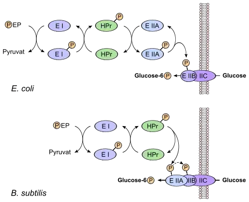Para el caso específico de la glucosa, el sistema de traslocación de grupo del PEP, transfiere el fosforilo del fosfoenolpiruvato a una histidina en EI. EI transfiere el fosfato a Hpr, y desde la Hpr el fosforilo se transfiere a la EIIA. La proteína EIIA es específica para la glucosa y esta a continuación transfiere el grupo fosforilo a la EIIB. Finalmente la EIIB fosforila a la glucosa mientras esta atraviesa la membrana a través de la enzima transmembrana II C (EIIC); produciendo glucosa 6-fosfato.[3]