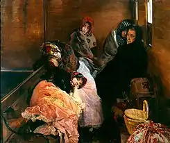En el cuadro aparecen representadas un grupo de mujeres vestidas a modo de campesinas con mantillas y pañuelos en sus cabezas que semejan estar dormitando, a excepción de la anciana de negro que las acompaña, la cual permanece despierta y vigilante. Con el angosto espacio que se refleja en el cuadro, el pintor trata de simbolizar la imposibilidad de huir del destino. Sin embargo, la alusión a la prostitución se hace de una manera velada, revelándose una gran piedad por parte del autor de cara al tema.[5]